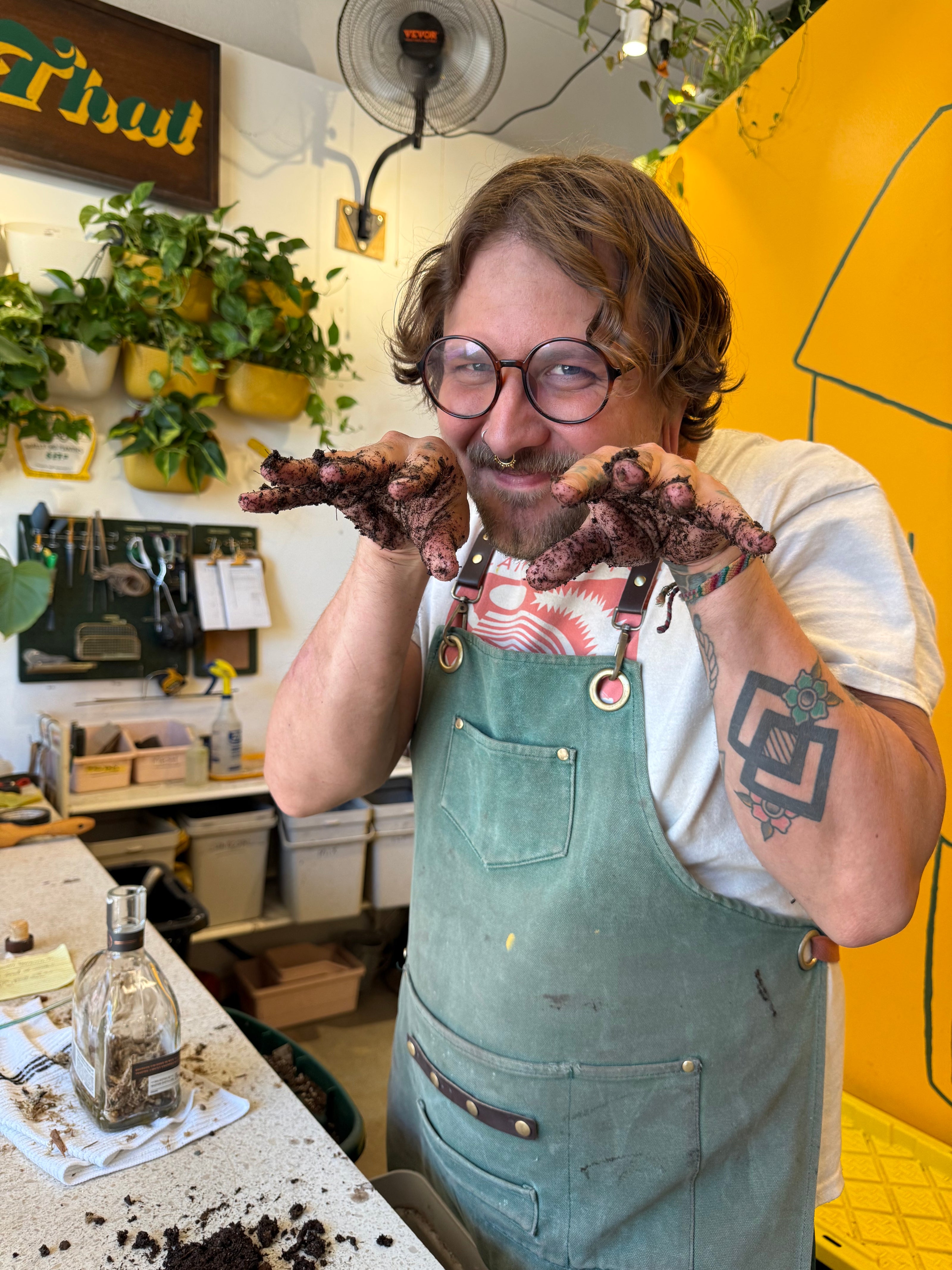 Phil can be found at the nearby greenhouse doing planty things like mixing soil, making stylized plants for the shop, or watering thirsty plants.