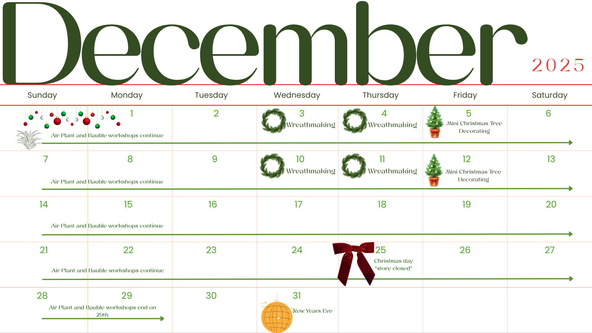 Workshop cost starts at $10 for a small bucket of ornaments to adorn your plant. Bauble Bar will be available from November 14th to December 29th. Walk-in anytime, no registration needed!