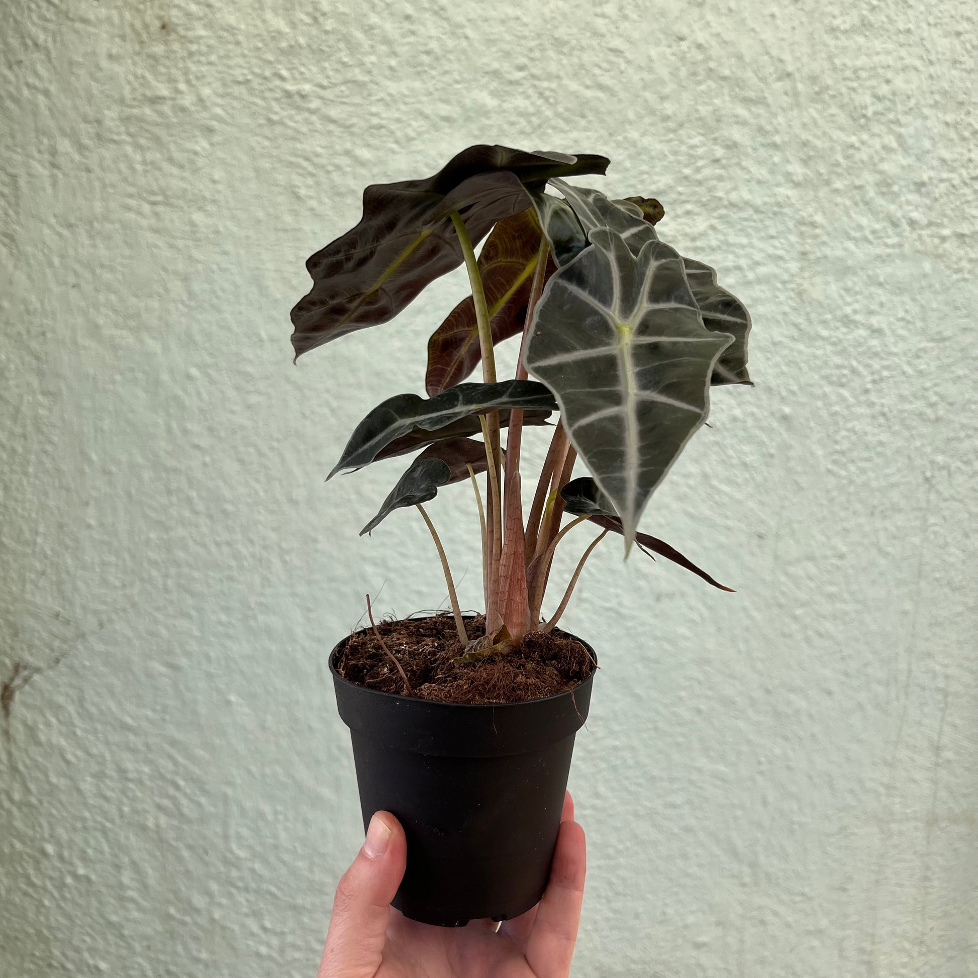 A mid-sized Alocasia that has dark green downward-pointed arrowhead leaves with light green veins and wavy margins.