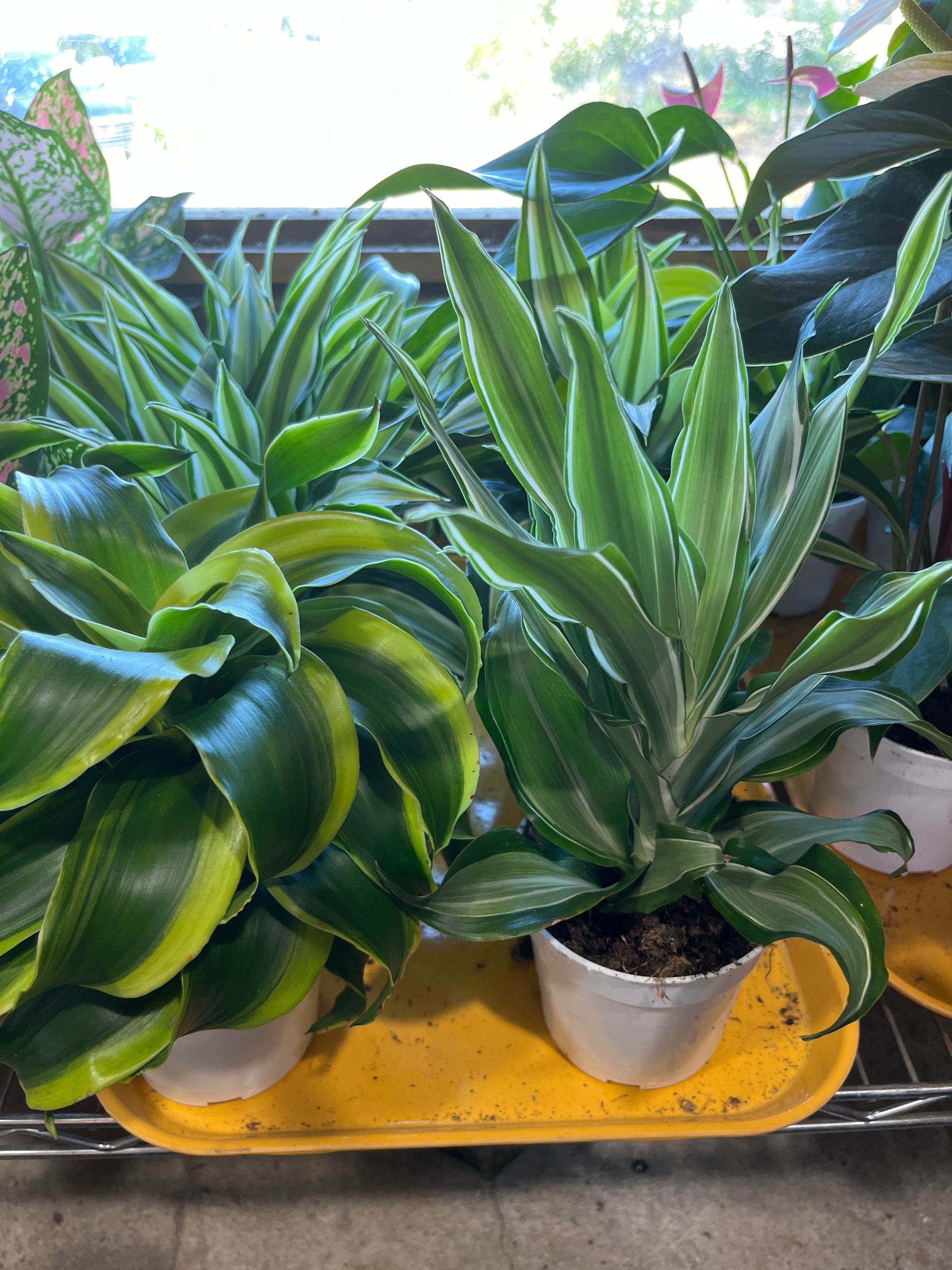 Assorted varieties of "dragon" Dracaena, these plants feature tufts of sword-shaped leaves on upright canes and can reach up to 4-5' indoors at maturity. Over time, it will lose lower leaves, exposing the stalk as it ages.