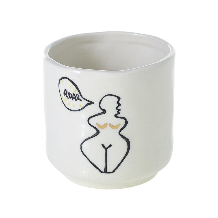 The clean white ceramic Hear Me Roar pot features a simple shape, an organic edge, and an exclusive decal design from artist Jessica Hiemstra.
