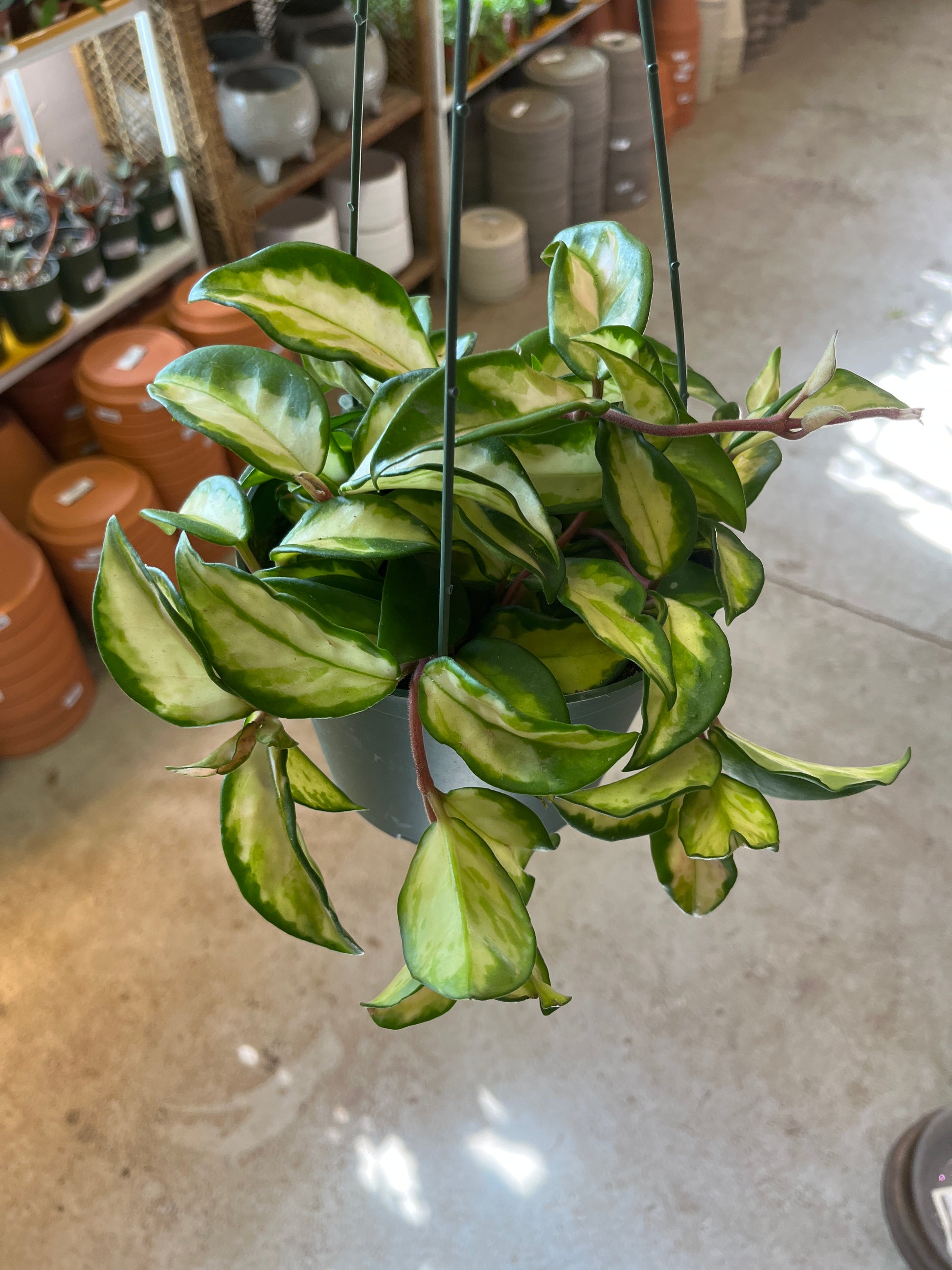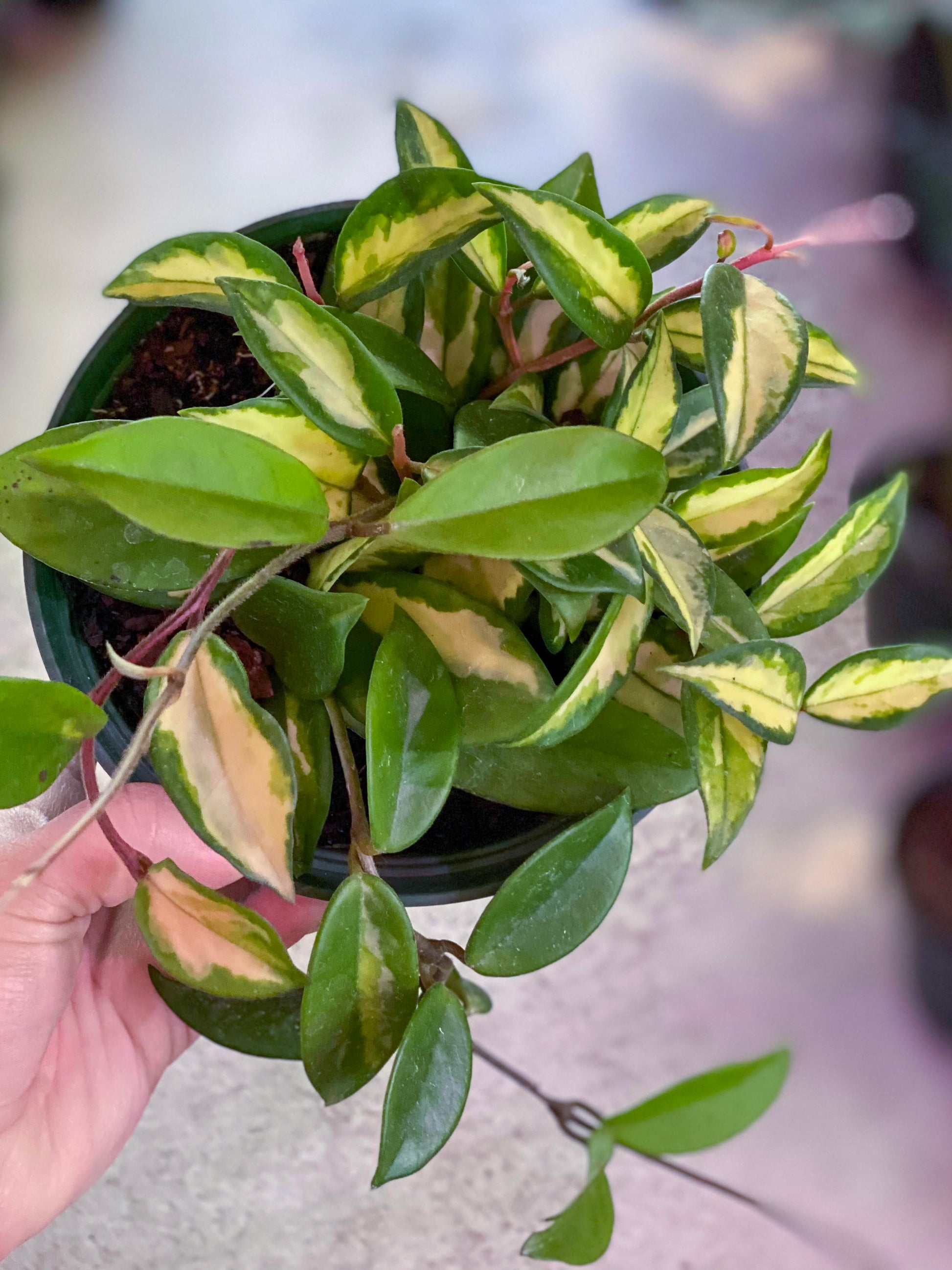 A variegated variety of the wax plant species (Hoyas), Crimson Princess has white and green variegated leaves that can be tinged with pink in the center on long burgundy stems. Safe for pets!