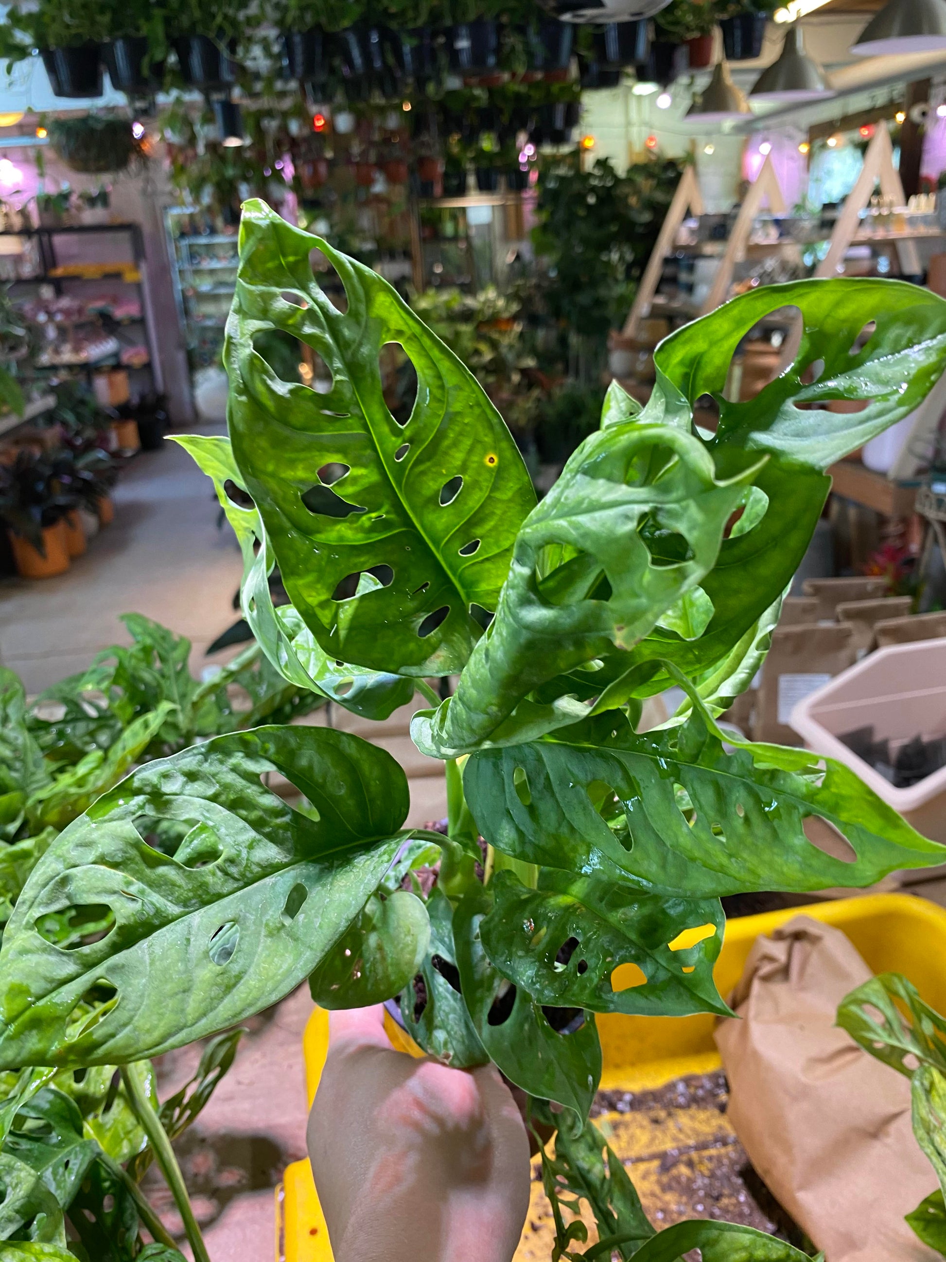 The Swiss cheese plant! Elongated fenestrated leaves on long trailing stems. Loves to climb!