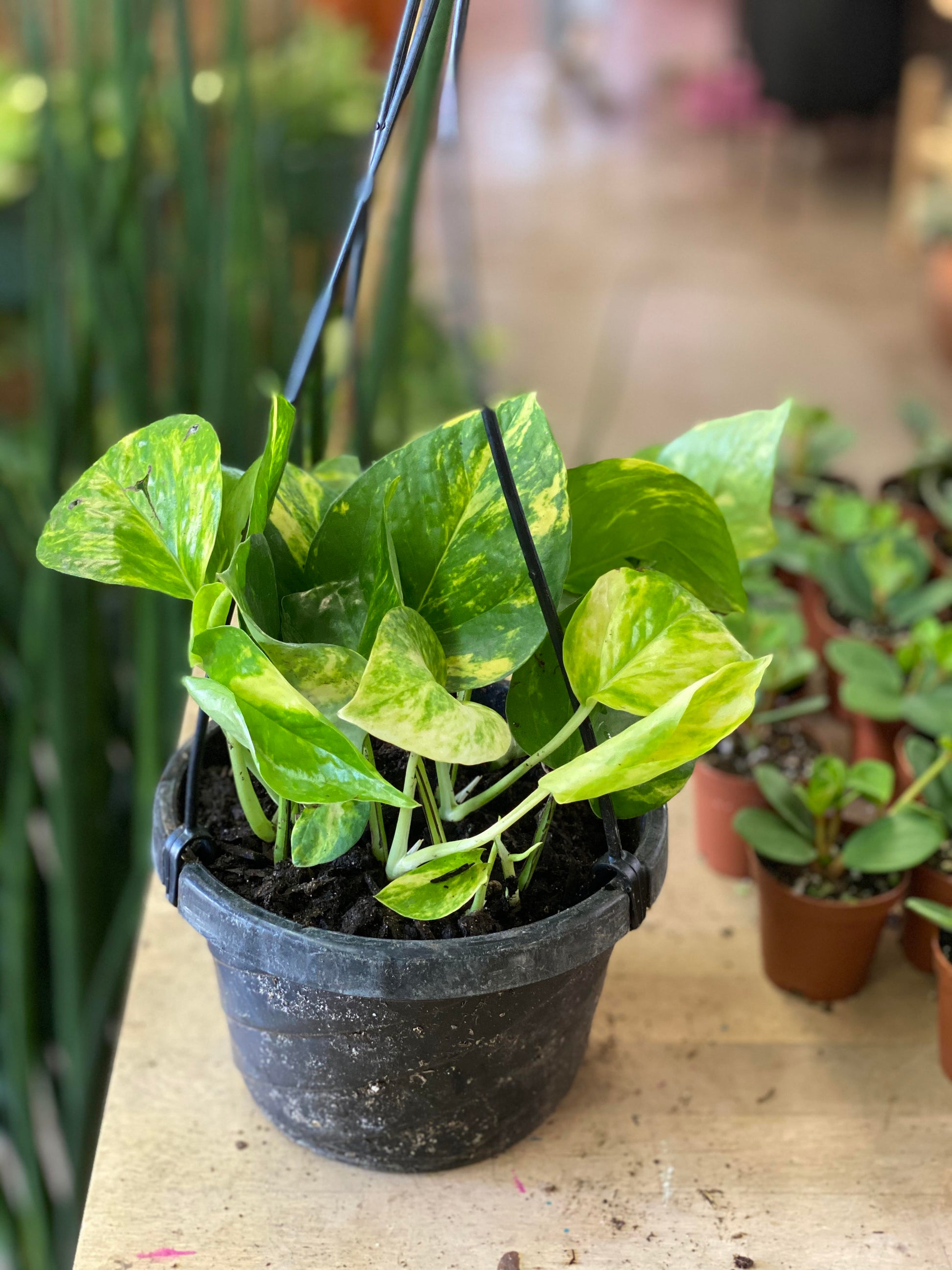 Easy to care for vining plant with yellow variegation splashed on dark green foliage. Looks beautiful in hanging baskets, on climbing poles, or trailing from shelves and furniture.