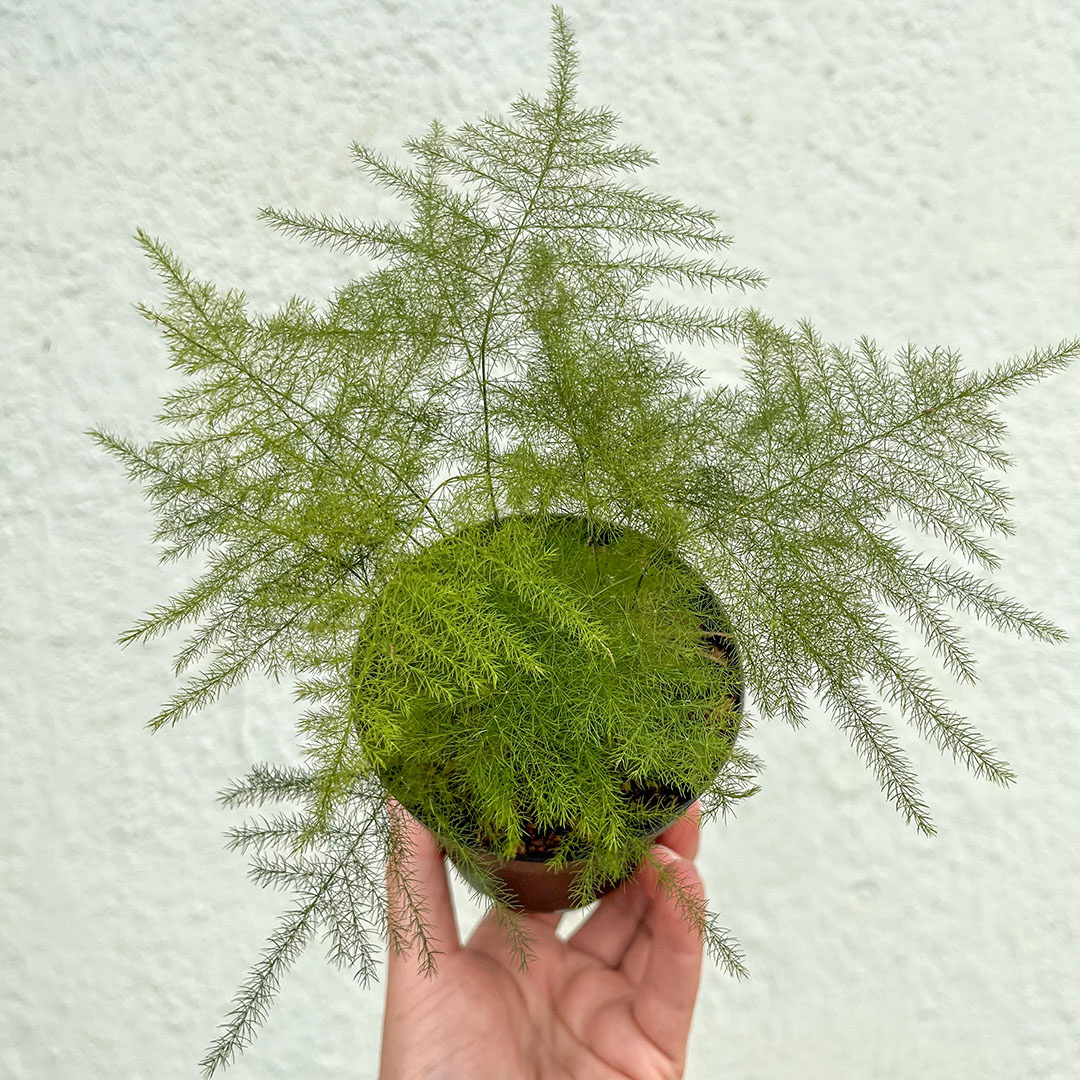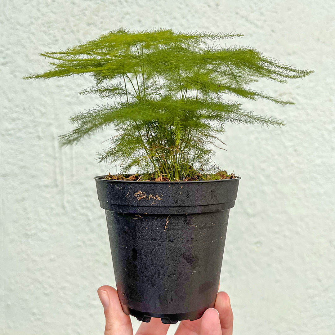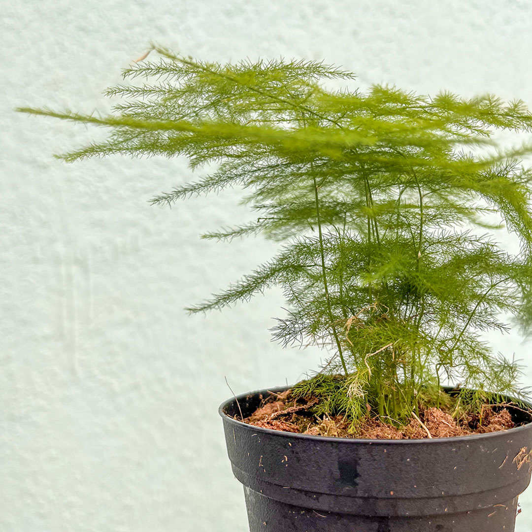 Not a true fern, asparagus ferns are plants in the Asparagus family with feathery, fern-like foliage. An easy to grow and fast-growing plant with a vining/scrambling growth habit, this one features soft foliage and arching stems covered in tiny thorns. They like to be repotted fairly often and you can let them grow large or trim them back to maintain smaller shape.