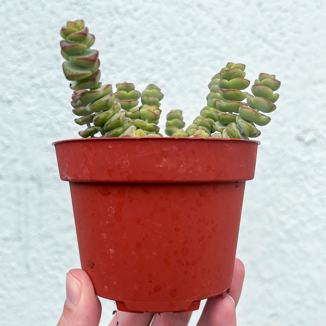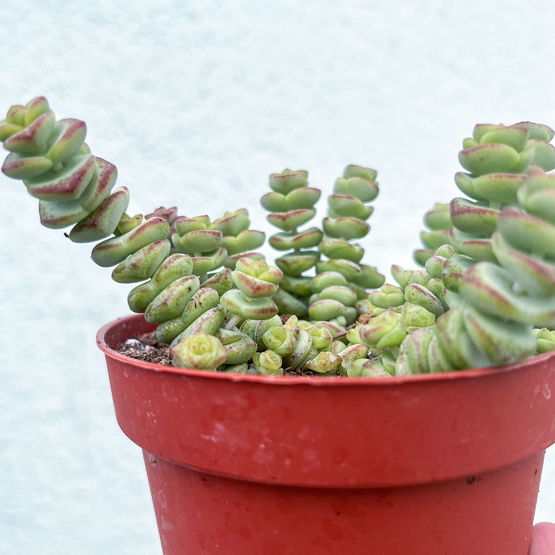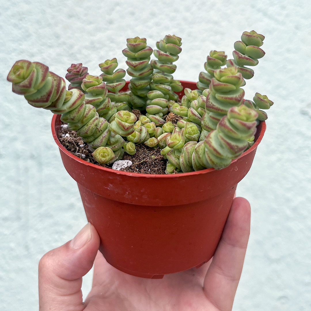 A unique succulent that forms towers of densely stacked, flat leaves. Plant stays relatively compact at about 6" tall at maturity.
