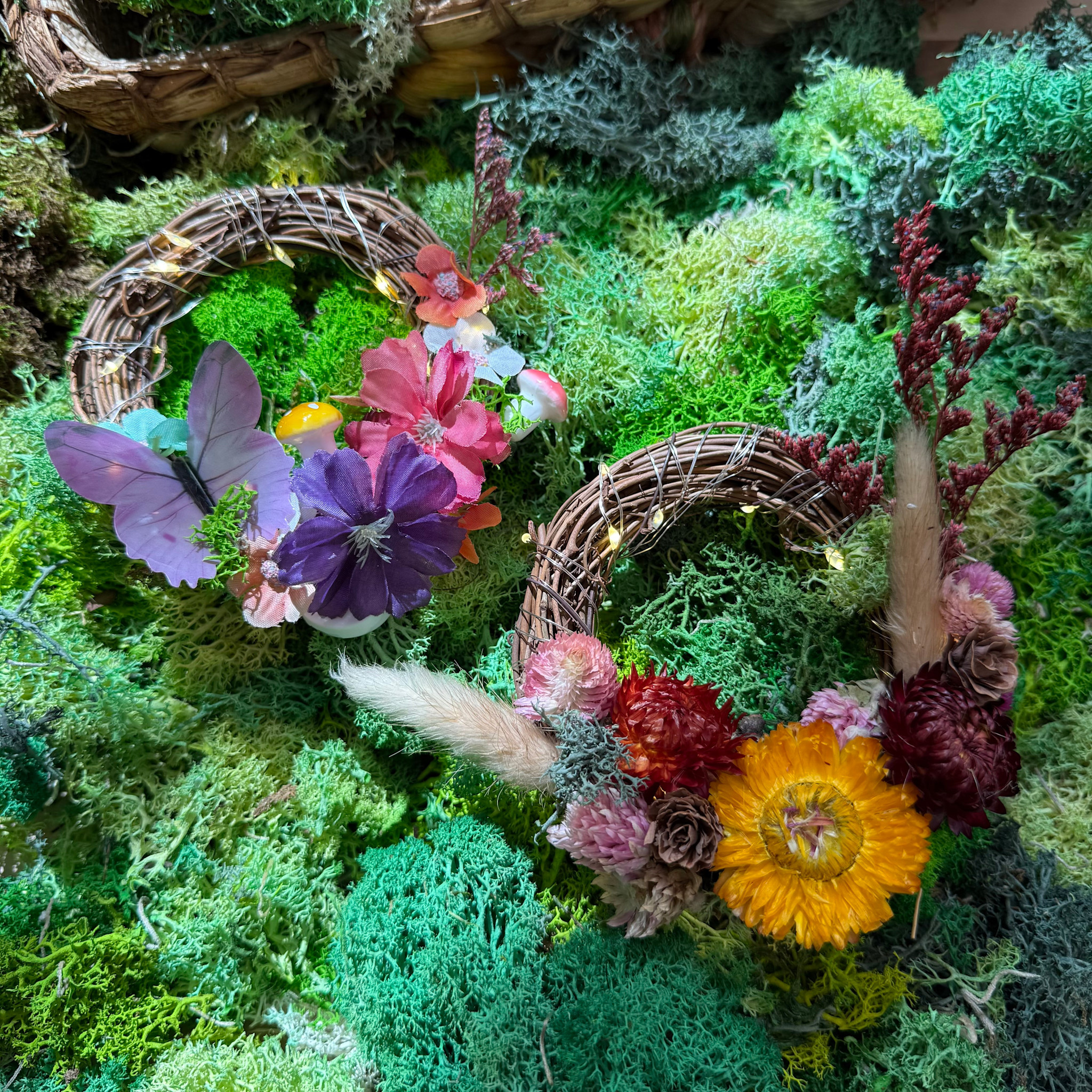 Create your very own Fall Fairy Wreath anytime this month during shop hours. Using materials like dried flowers, moss, or even fairy lights, this easy activity is open for all ages. These wreaths can be used as a door hanging, or as a playful decor piece in your space!