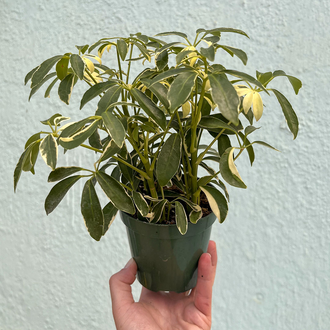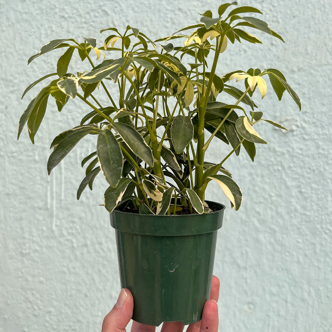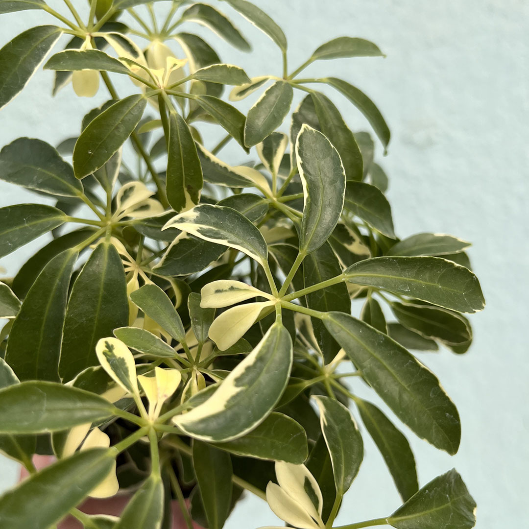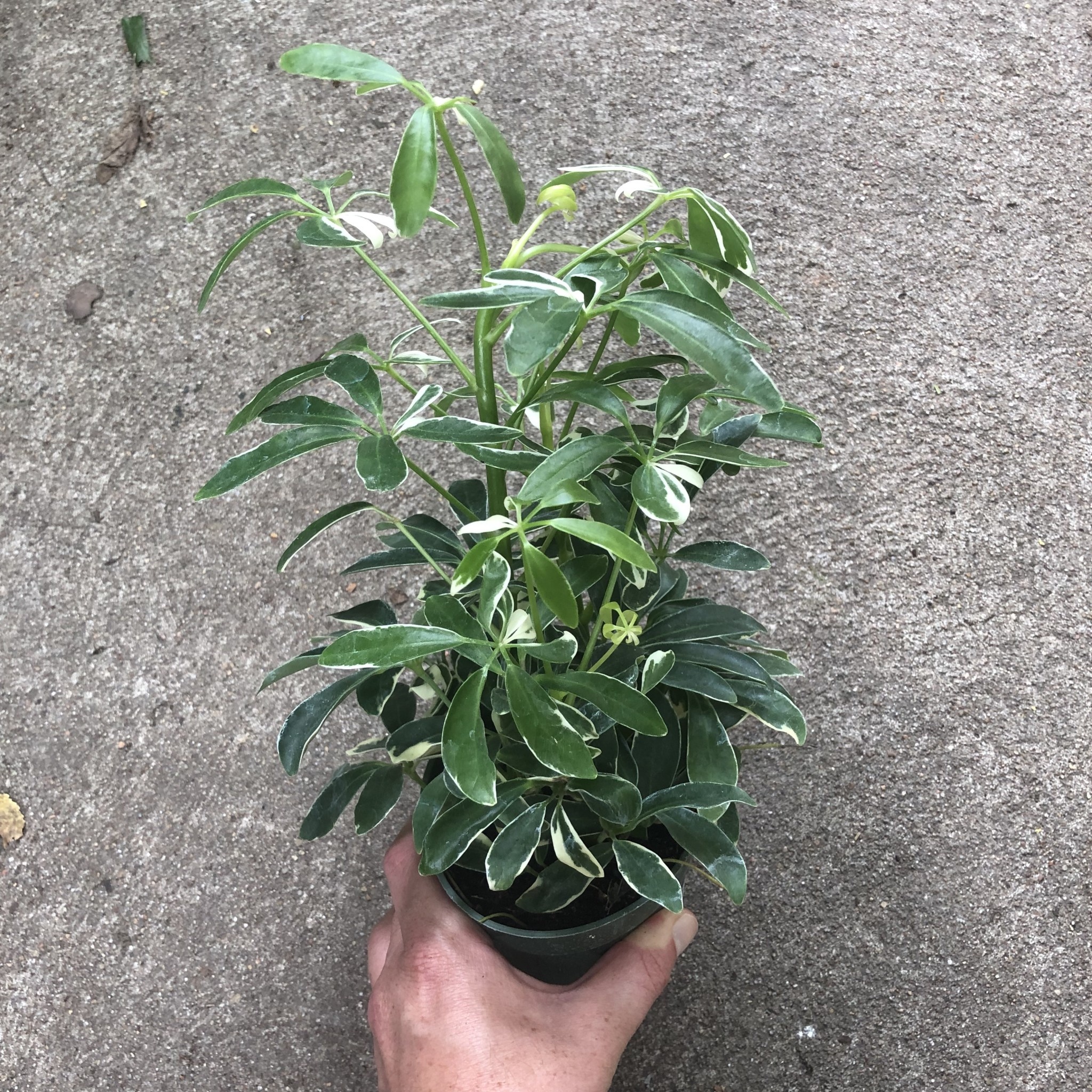 This Schefflera bush features palmate clusters of variegated green and white leaves that droop slightly to form an umbrella shape. Easy to care for and a fast grower.